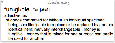 In relation to the actual post however then whether a book is fungible or not is surely related to the person – for a book seller, books have the best seller tag (or not) and a genre tag as well as a price and profit margin (plus I’m sure lots of trade related information) – however teh book itself is entirely fungible. for the Author, the book is definitely NOT fungible – this one is mine and that fact is very important.